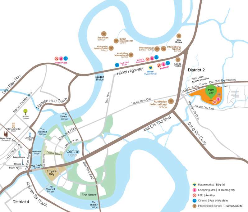 ♦ Khoảng 1-4 km (3-7 phút) đến các trường quốc tế nổi tiếng như Trường Quốc Tế Úc, Trường Quốc Tế Hồ Chí Minh, Trường Quốc Tế Anh và Trường Quốc Tế Mỹ.